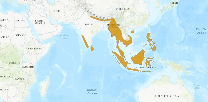 Habitat: Deze soort wordt voornamelijk geassocieerd met heuvelbossen, in de beboste gebieden van tropisch Azië. In India komen ze vaker voor in de West-Ghats dan langs de Himalaya waar ze voorkomen van Nepal tot Assam. |
