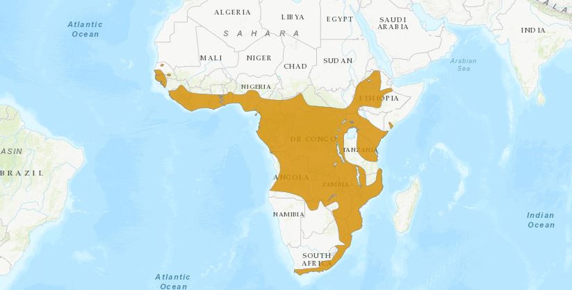 Leefgebied: Angola, Benin, Botswana, Burundi, Kameroen, Kongo, Ivoorkust, Equatoriaal-Guinea, Ethiopië, Gabon, Gambia, Ghana, Guinee, Guinee-Bissau, Kenia, Liberia, Malawi, Mozambique, Namibië, Nigeria, Rwanda, Senegal, Sierra Leone, Somalië, Zuid-Afrika, Soedan, Swaziland, Tanzania, Togo; Oeganda, Zambia, Zimbabwe. |